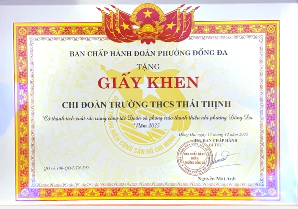 Đồng thời, xin nhiệt liệt chúc mừng cô giáo Lộc Thị Liên – Giáo viên Tổng phụ trách Đội Thiếu niên Tiền phong Hồ Chí Minh Trường THCS Thái Thịnh – đã được trao Giấy khen vì thành tích xuất sắc trong công tác Đoàn và phong trào Thiếu nhi năm 2025. Thành quả này là minh chứng cho tâm huyết, sự tận tụy và những đóng góp bền bỉ của cô trong công tác giáo dục, bồi dưỡng thế hệ măng non.
