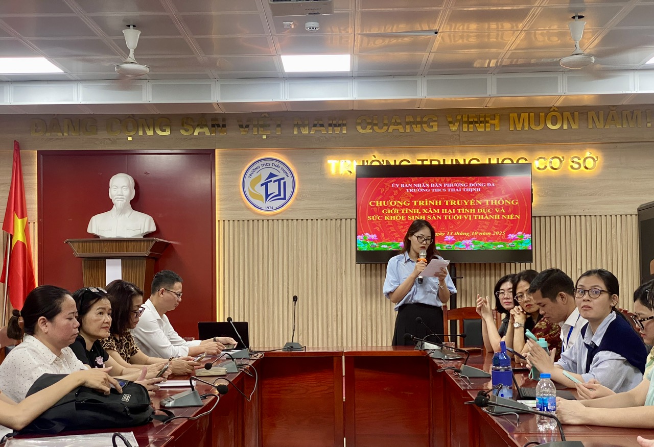 Căn cứ Công văn số 2865/SGDĐT-CTTTHSSV của Sở Giáo dục và Đào tạo Hà Nội về việc phối hợp triển khai chương trình truyền thông, giáo dục chăm sóc sức khỏe sinh sản vị thành niên, thanh niên năm 2025, hoạt động hôm nay mang ý nghĩa thiết thực, giúp thầy cô và học sinh được trang bị những kiến thức khoa học, đúng đắn về chăm sóc sức khỏe, xây dựng môi trường học đường an toàn – lành mạnh – thân thiện. Trong chương trình sinh hoạt dưới cờ vừa qua, Thứ 2, ngày 13/10/2025, trường THCS Thái Thịnh vui mừng được đón tiếp hai chuyên gia đến từ Hội Giáo dục chăm sóc sức khỏe cộng đồng Việt Nam tới chia sẻ cùng thầy và trò nhà trường: