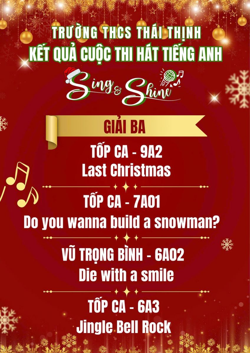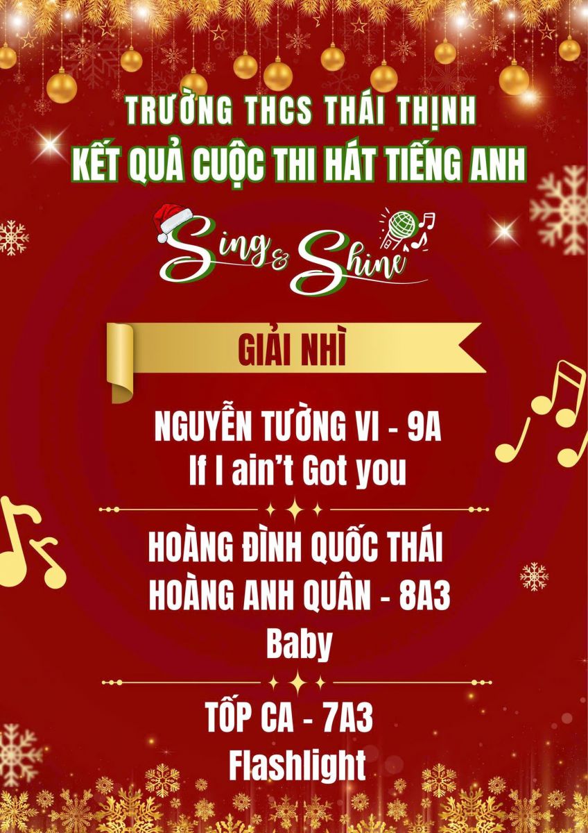 Trường THCS Thái Thịnh xin chúc mừng các cá nhân và tập thể đã xuất sắc tỏa sáng tại cuộc thi Hát tiếng Anh Sing & Shine lần thứ nhất. Cuộc thi không chỉ là sân chơi nghệ thuật bổ ích mà còn là nơi các em học sinh thể hiện niềm đam mê âm nhạc, khả năng tiếng Anh và sự tự tin trên sân khấu