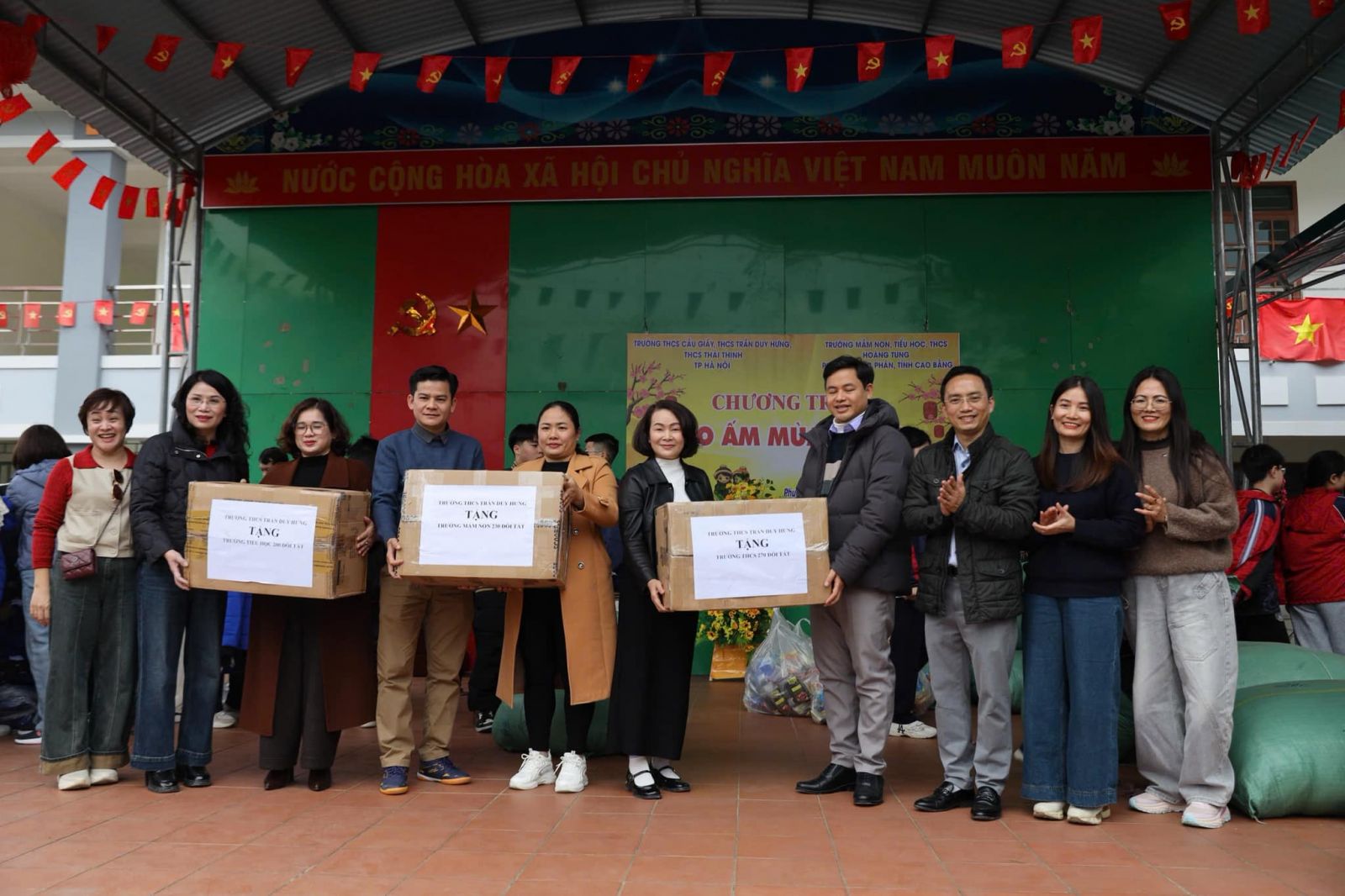 Đồng hành cùng THCS Thái Thịnh trong chuyến đi năm nay là trường THCS Cầu Giấy và trường THCS Trần Duy Hưng. Đoàn đã đến thăm và trao tặng nhiều phần quà thiết thực, ý nghĩa cho các em học sinh của ba cấp học: Mầm non, Tiểu học và THCS Hoàng Tung, thuộc phường Thục Phán, tỉnh Cao Bằng.