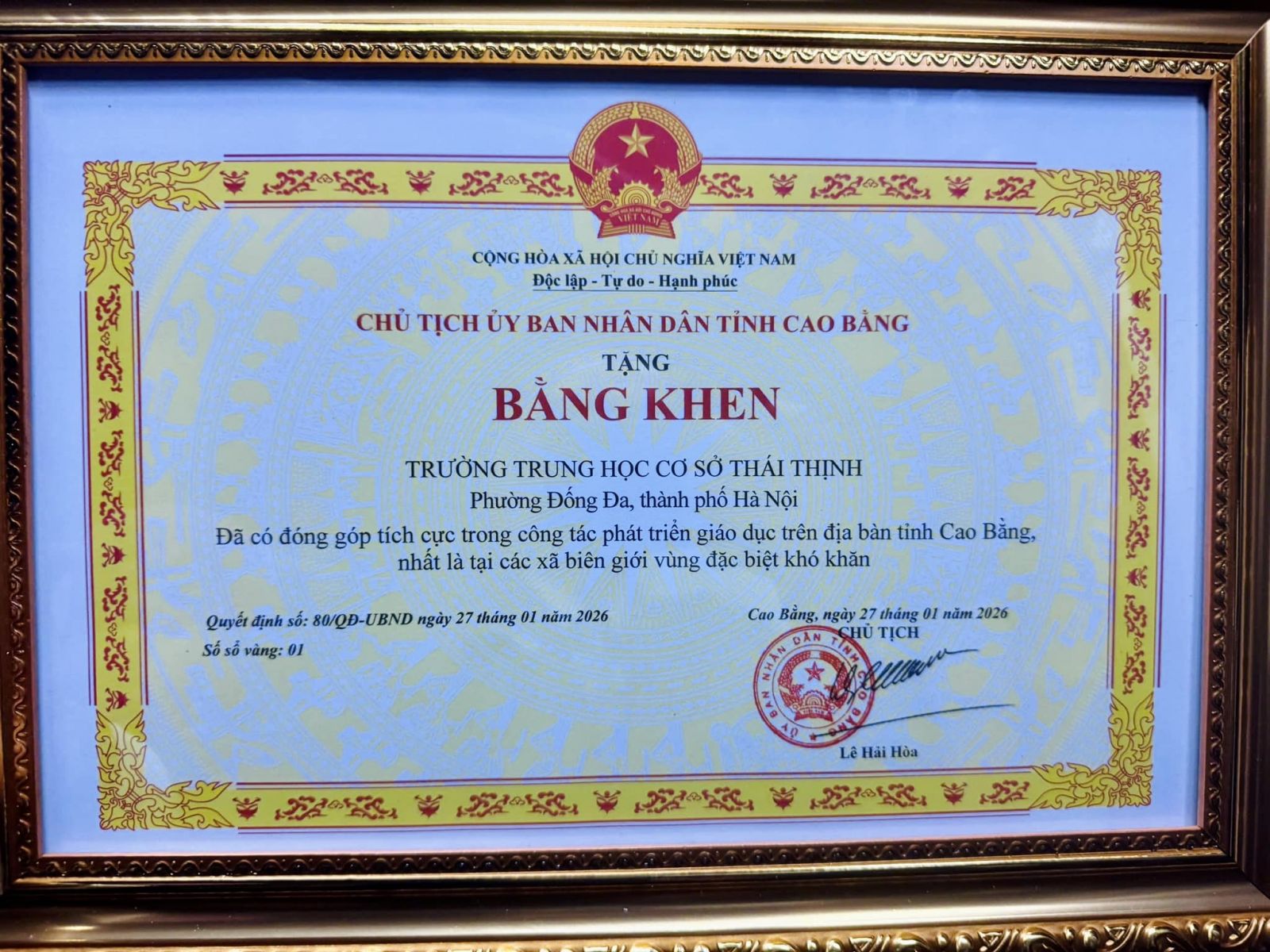 - Nhân dịp này, Chủ tịch UBND tỉnh Cao Bằng đã trao Bằng khen cho Trường THCS Thái Thịnh, Trường THCS Trần Duy Hưng và Trường THCS Cầu Giấy vì đã có nhiều đóng góp tích cực trong công tác hỗ trợ, phát triển giáo dục trên địa bàn tỉnh Cao Bằng, đặc biệt tại các xã biên giới, vùng đặc biệt khó khăn.