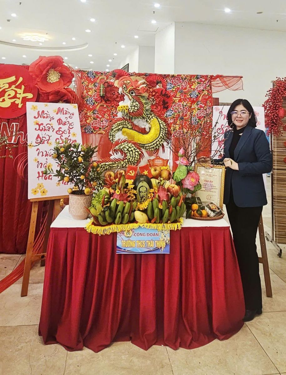 Mâm ngũ quả được trang trí công phu, hài hòa sắc xuân nhờ bàn tay khéo léo và tinh tế của các cô giáo trong ban nữ công của nhà trường với mong muốn gửi gắm thông điệp về sum vầy, đủ đầy và những điều tốt đẹp trong năm mới.