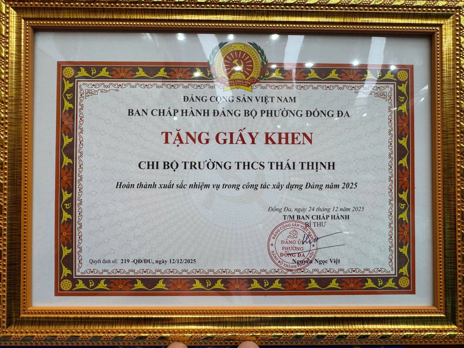 Chi bộ trường THCS Thái Thịnh vinh dự được tặng Giấy khen hoàn thành xuất sắc nhiệm vụ trong công tác xây dựng Đảng năm 2025 - minh chứng cho vai trò hạt nhân lãnh đạo vững mạnh của Chi bộ nhà trường.