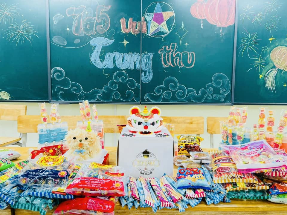Không chỉ dừng lại ở việc trang trí mâm cỗ Trung thu truyền thống đầy đủ hương vị và sắc màu, lớp 7A5 còn khéo léo biến không gian lớp học thành một bức tranh rực rỡ với đèn lồng lung linh, sắc đỏ vàng ấm áp, tạo nên bầu không khí ngập tràn niềm vui.