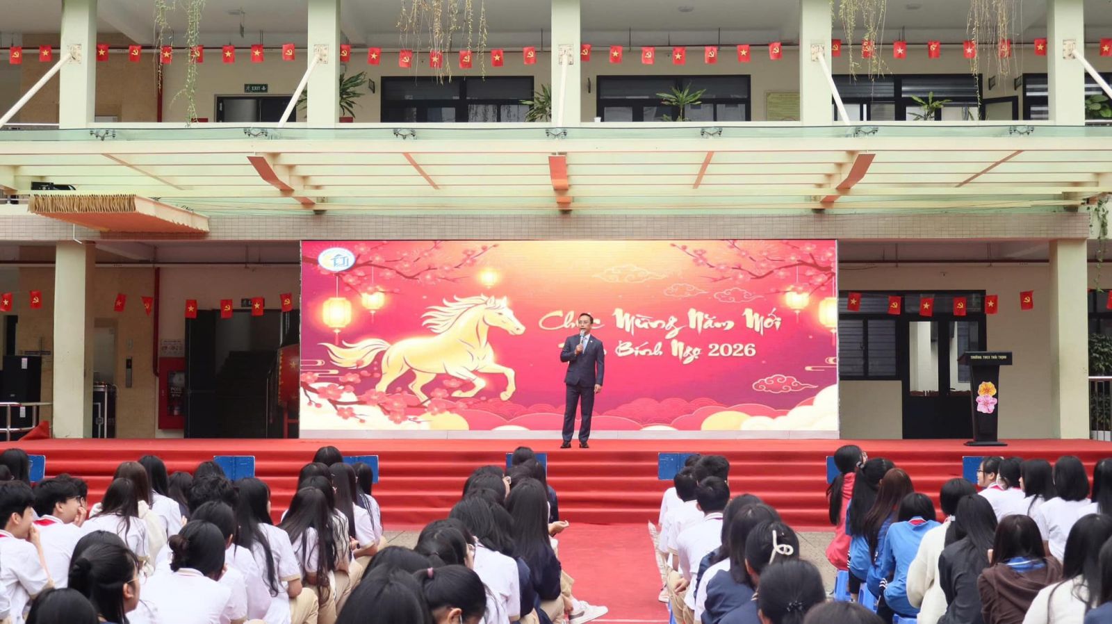 Tại buổi sinh hoạt, Thầy Hiệu trưởng đã gửi lời chúc Tết ấm áp, chân thành tới toàn thể cán bộ, giáo viên và học sinh nhà trường. Thầy bày tỏ niềm tin và kỳ vọng vào một năm học thành công, bứt phá mạnh mẽ; đặc biệt gửi lời chúc tới các em học sinh khối 9 – những “chiến binh” cuối cấp – sẽ vững vàng, tự tin và đạt được mọi nguyện vọng trong kỳ thi quan trọng phía trước.