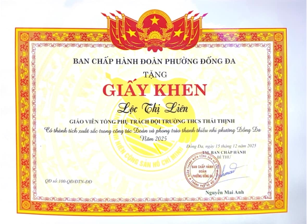 Đồng thời, xin nhiệt liệt chúc mừng cô giáo Lộc Thị Liên – Giáo viên Tổng phụ trách Đội Thiếu niên Tiền phong Hồ Chí Minh Trường THCS Thái Thịnh – đã được trao Giấy khen vì thành tích xuất sắc trong công tác Đoàn và phong trào Thiếu nhi năm 2025. Thành quả này là minh chứng cho tâm huyết, sự tận tụy và những đóng góp bền bỉ của cô trong công tác giáo dục, bồi dưỡng thế hệ măng non.