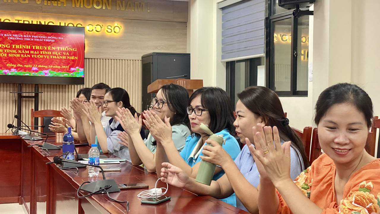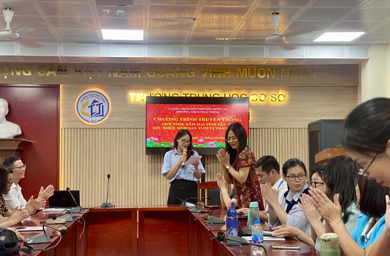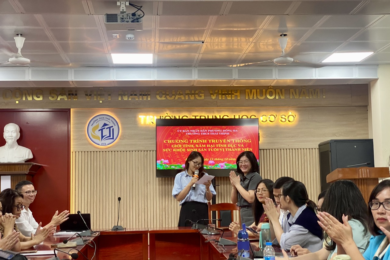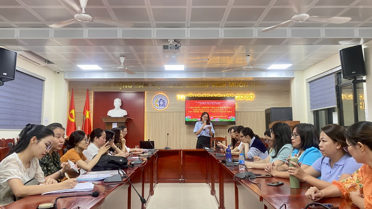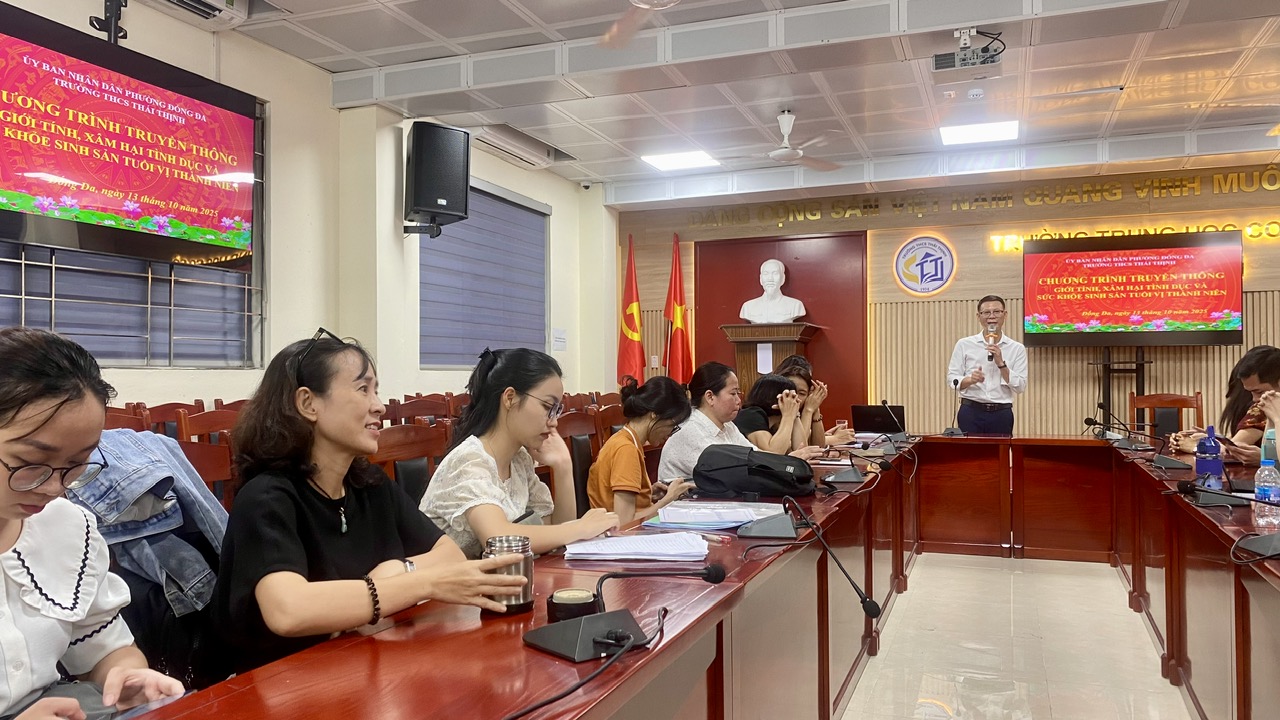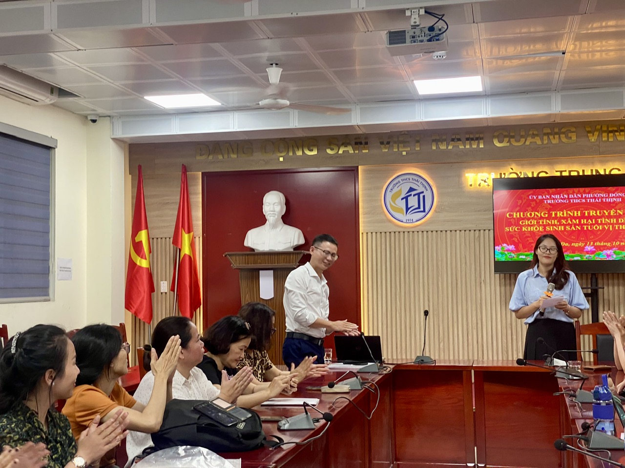 Căn cứ Công văn số 2865/SGDĐT-CTTTHSSV của Sở Giáo dục và Đào tạo Hà Nội về việc phối hợp triển khai chương trình truyền thông, giáo dục chăm sóc sức khỏe sinh sản vị thành niên, thanh niên năm 2025, hoạt động hôm nay mang ý nghĩa thiết thực, giúp thầy cô và học sinh được trang bị những kiến thức khoa học, đúng đắn về chăm sóc sức khỏe, xây dựng môi trường học đường an toàn – lành mạnh – thân thiện. Trong chương trình sinh hoạt dưới cờ vừa qua, Thứ 2, ngày 13/10/2025, trường THCS Thái Thịnh vui mừng được đón tiếp hai chuyên gia đến từ Hội Giáo dục chăm sóc sức khỏe cộng đồng Việt Nam tới chia sẻ cùng thầy và trò nhà trường: