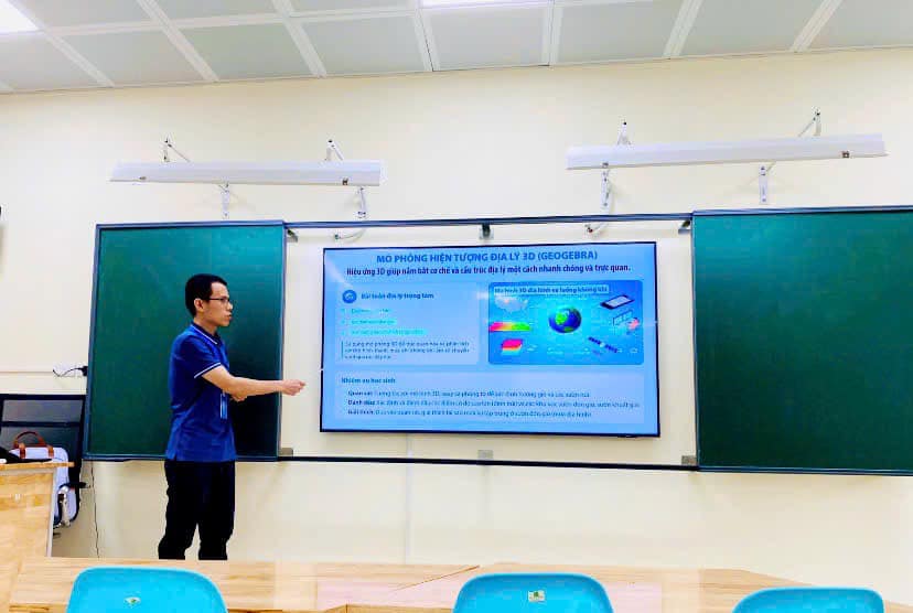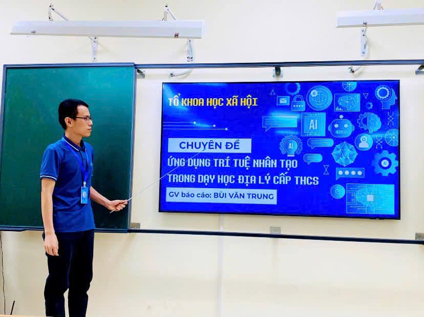 - Trong buổi chuyên đề, thầy Trung đã giới thiệu nhiều ứng dụng AI hiện đại trong thiết kế bài giảng, xây dựng bản đồ trực tuyến, mô phỏng không gian địa lí, đồng thời chia sẻ những kinh nghiệm áp dụng vào thực tiễn lớp học.