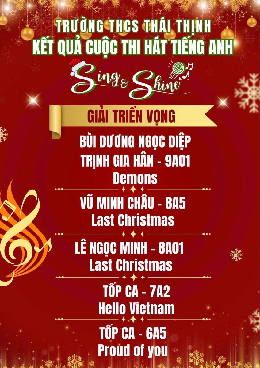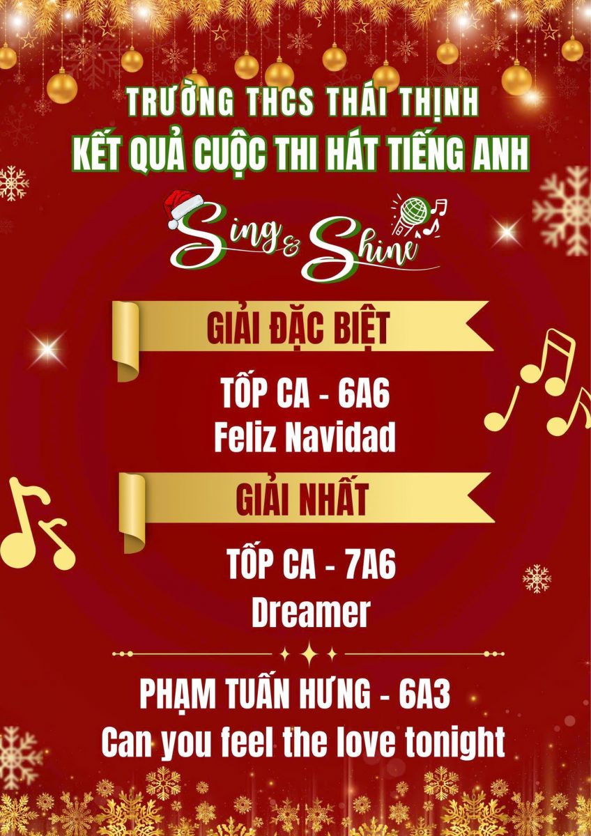 Trường THCS Thái Thịnh xin chúc mừng các cá nhân và tập thể đã xuất sắc tỏa sáng tại cuộc thi Hát tiếng Anh Sing & Shine lần thứ nhất. Cuộc thi không chỉ là sân chơi nghệ thuật bổ ích mà còn là nơi các em học sinh thể hiện niềm đam mê âm nhạc, khả năng tiếng Anh và sự tự tin trên sân khấu