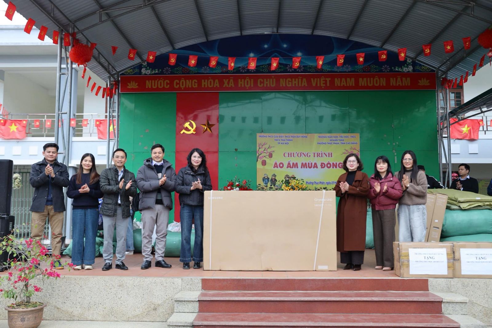 Đồng hành cùng THCS Thái Thịnh trong chuyến đi năm nay là trường THCS Cầu Giấy và trường THCS Trần Duy Hưng. Đoàn đã đến thăm và trao tặng nhiều phần quà thiết thực, ý nghĩa cho các em học sinh của ba cấp học: Mầm non, Tiểu học và THCS Hoàng Tung, thuộc phường Thục Phán, tỉnh Cao Bằng.