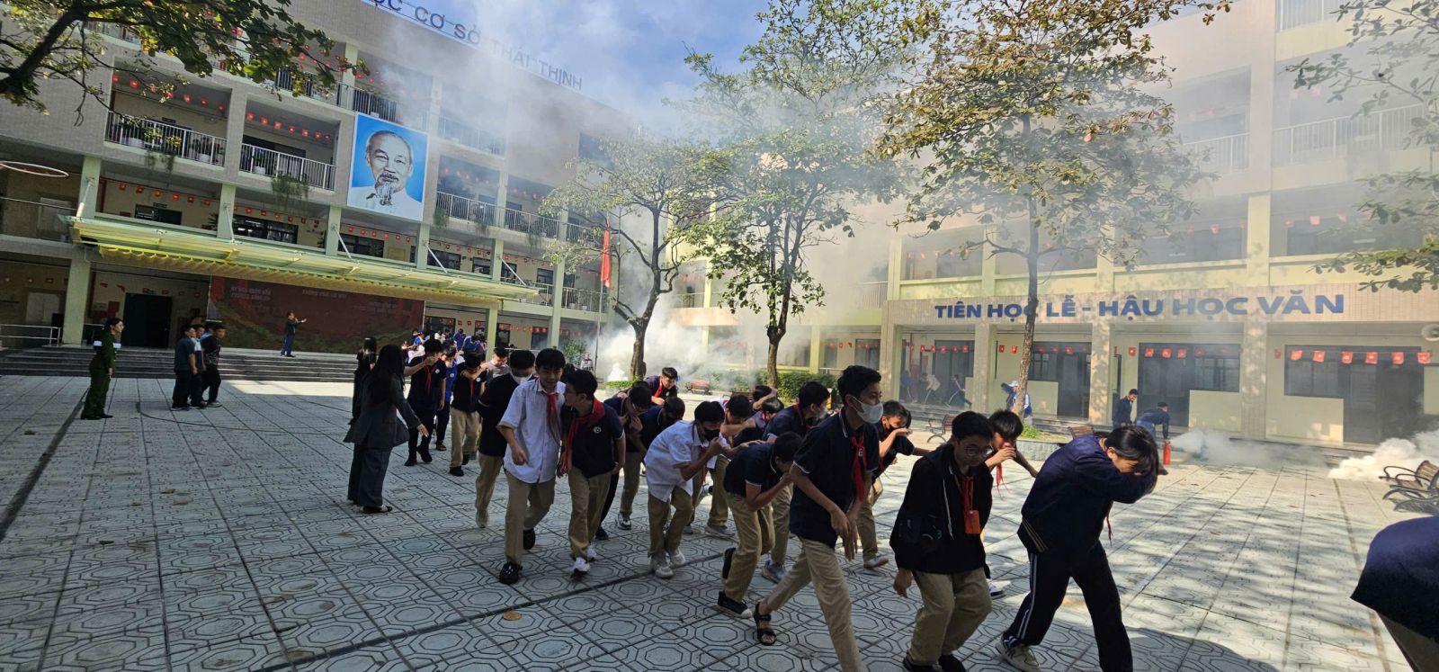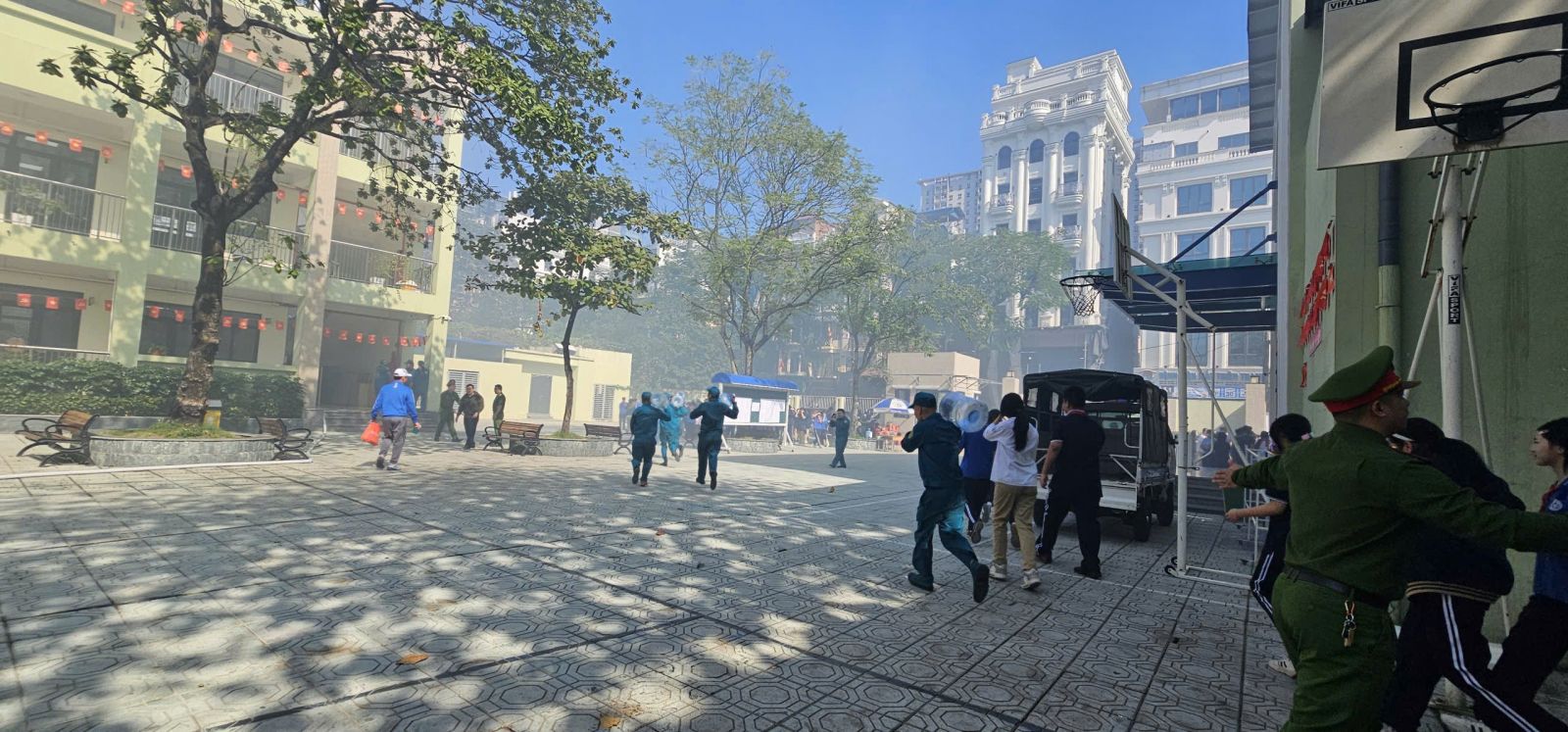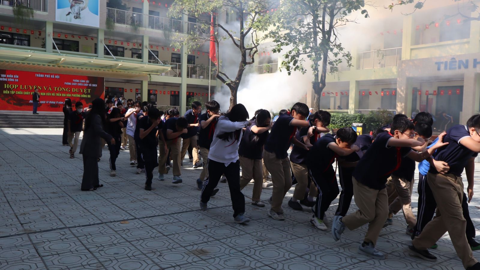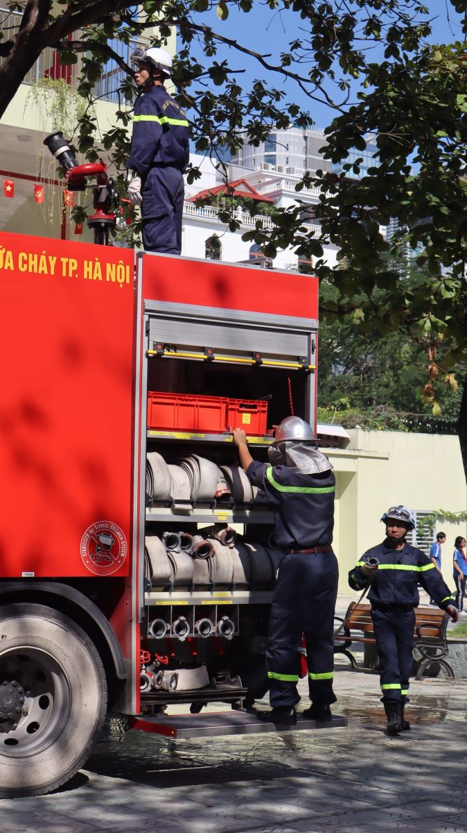 -Trong buổi tổng duyệt, các tình huống giả định được xây dựng sát với thực tế: cháy tại khu vực phòng học, có người bị mắc kẹt, khói lan nhanh… Lực lượng chữa cháy và cứu nạn đã nhanh chóng triển khai phương án báo động, sơ tán học sinh, dập lửa, cứu người và xử lý tình huống khẩn cấp một cách nhịp nhàng, chính xác và an toàn tuyệt đối.