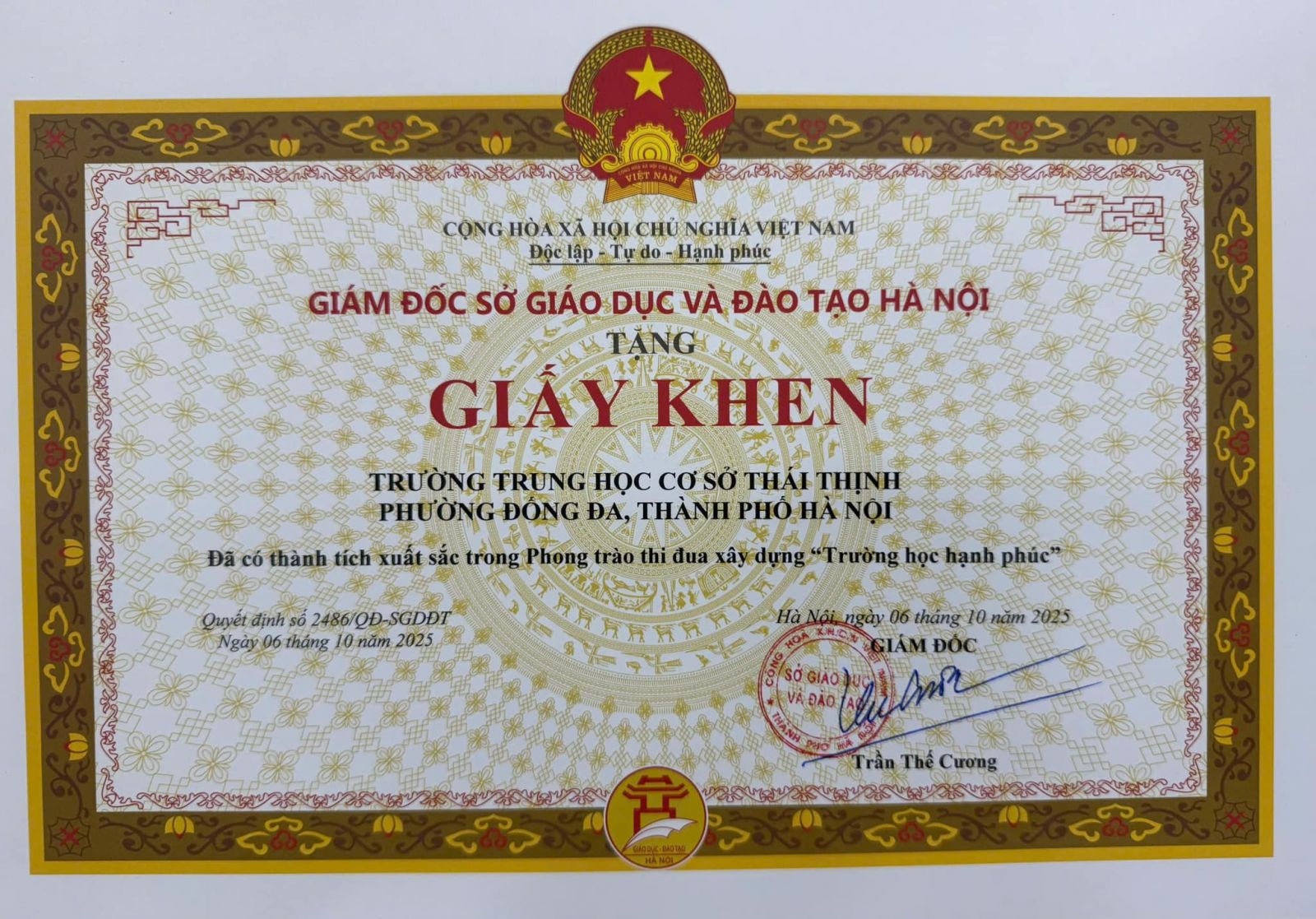 Giám đốc Sở GD&ĐT Hà Nội cũng đã quyết định tặng Giấy khen cho các tập thể và cá nhân có thành tích xuất sắc trong phong trào xây dựng "Trường học hạnh phúc". Trường THCS Thái Thịnh, phường Đống Đa vinh dự là 1 trong 19 trường THCS của 126 xã phường được nhận Giấy khen. Thầy Nguyễn Cao Cường, Hiệu trưởng nhà trường cho biết: "Đây là phần thưởng tạo động lực cho nhà trường trong giai đoạn tiếp theo. Nhà trường thực hiện theo phương châm “Hạnh phúc không phải là đích đến mà là một cuộc hành trình”, từ những điều bình dị hành ngày. THCS Thái Thịnh quyết tâm tiếp tục xây dựng ngôi trường ngày càng phát triển toàn diện, mang lại nhiều niềm vui, hạnh phúc cho học trò, các Thầy cô giáo, cha mẹ học sinh, lan toả tới cộng đồng."