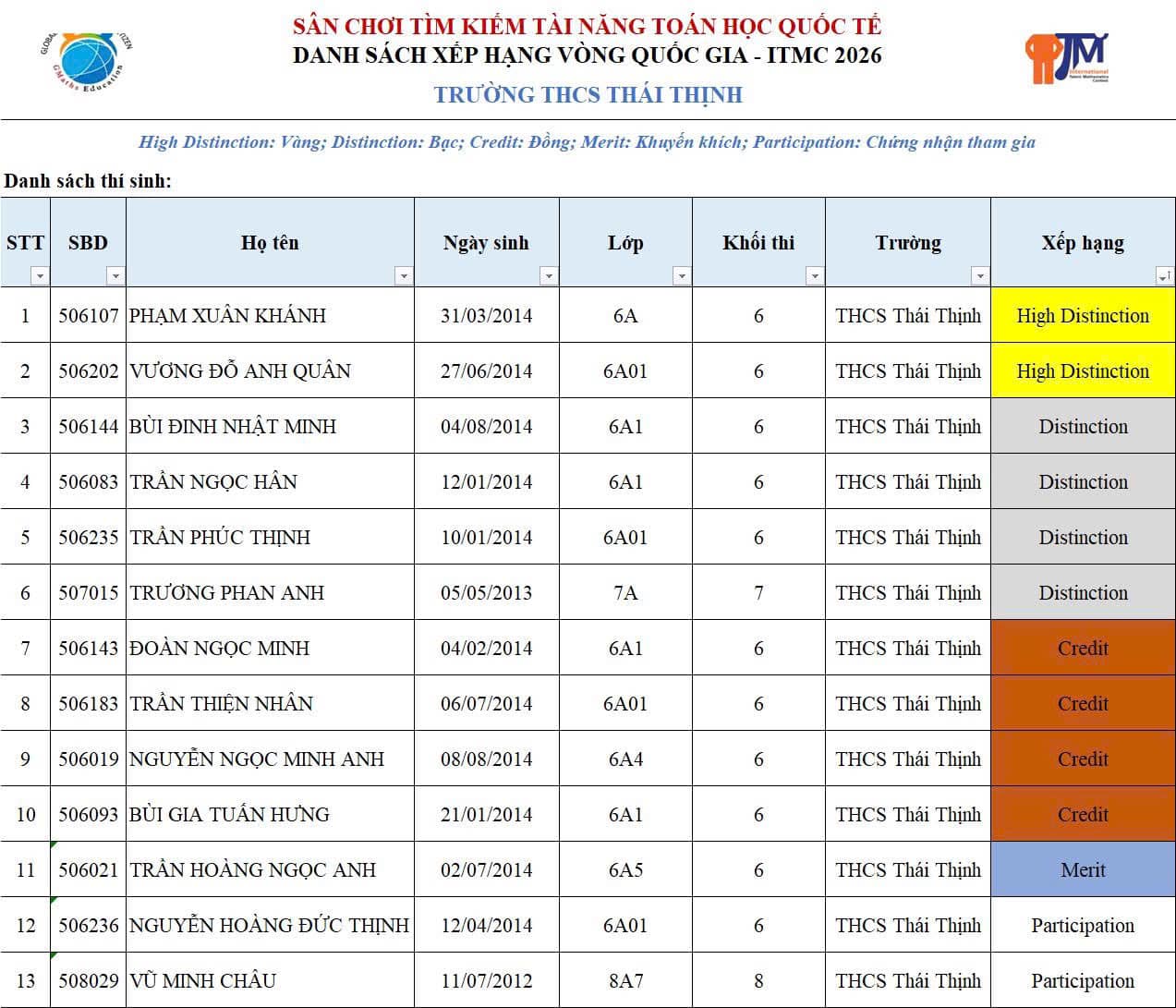 Danh sách học sinh đạt giải: