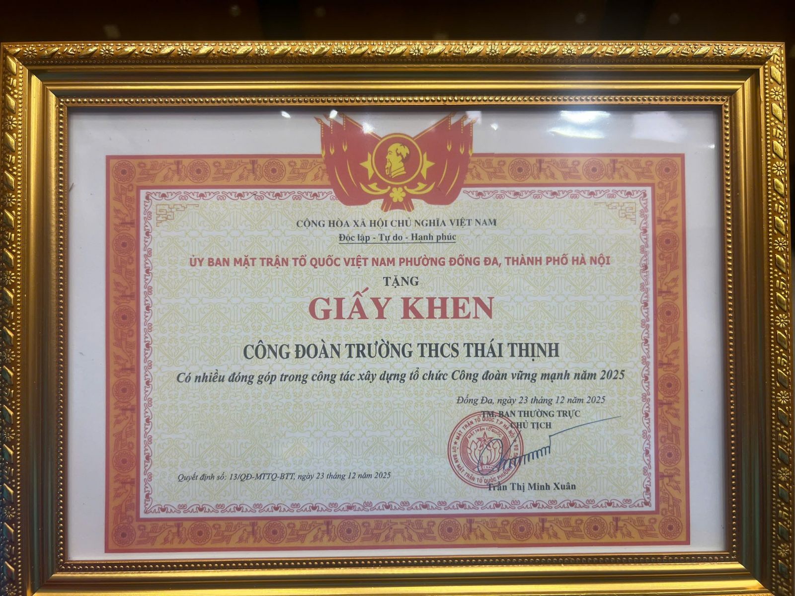 Chi bộ trường THCS Thái Thịnh vinh dự được tặng Giấy khen hoàn thành xuất sắc nhiệm vụ trong công tác xây dựng Đảng năm 2025 - minh chứng cho vai trò hạt nhân lãnh đạo vững mạnh của Chi bộ nhà trường.